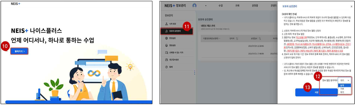자녀가 나이스플러스에 자신의 계정으로 로그인하여 보호자 승인관리에서 보호자 확인 및 학생 정보에 대한 열람을 동의처리합니다. 동의를 완료하면 완료됩니다.