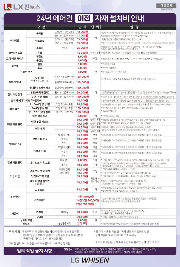 2024년 3월 8일 적용되는 에어컨 이전 자재 설치비 단가입니다. 자재에 대한 단가이기에 출장비와 수리비의 개념은 포함되어 있지 않습니다.
